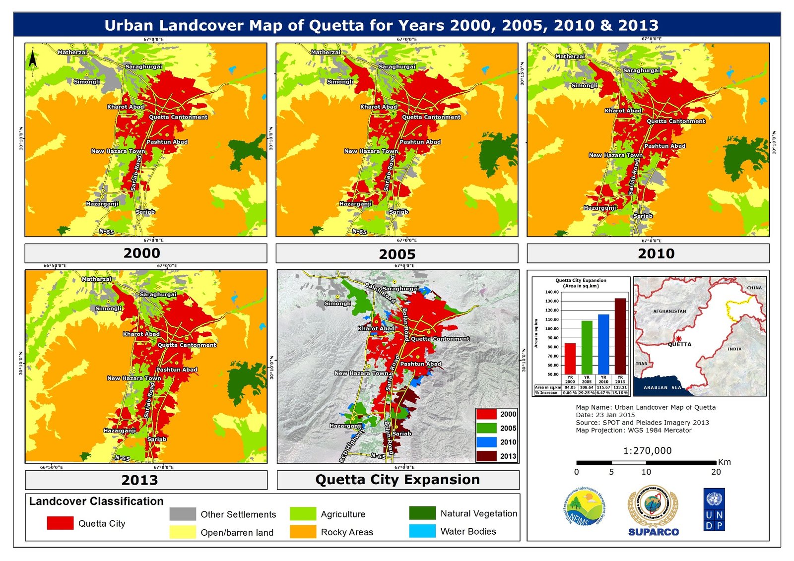 SUPARCO uses multi-spectral satellite imagery and change detection techniques to monitor land cover and agricultural conditions across Pakistan. National land cover maps developed for 2010 and 2019 provide a consistent baseline to track changes in croplands, forests, rangelands, and built-up areas. Satellite-based vegetation indices are used to assess crop health, seasonal growth, and climate-related stress. The information supports evidence-based planning for food security, sustainable land management, and climate-resilient agriculture.